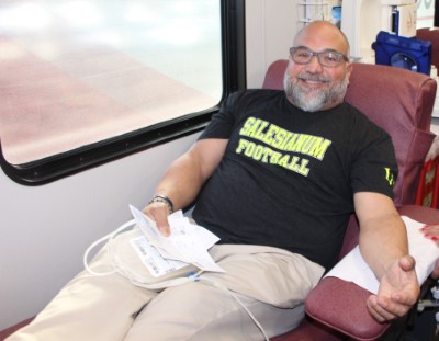 For Chris Flaherty, this was his second time donating blood. He said Facebook posts by fellow 1990 grad Tony Prado, who works for the Blood Bank of Delmarva, and other friends inspired him to donate blood. That, and the notification from the Salesianum Alumni Association brought him in today.