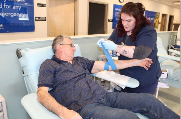 Blood Collection Tech Ava Pembroke bandages whole blood donor Pawel Hyra.