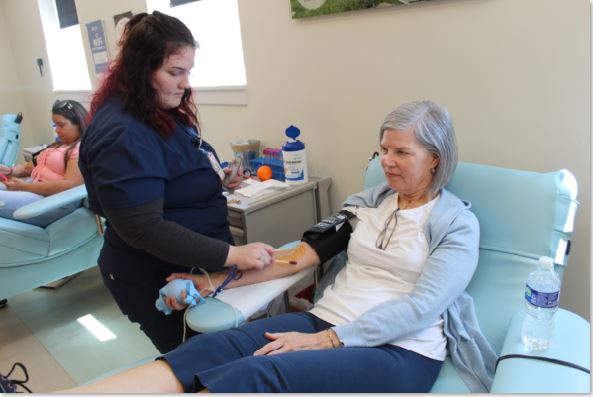 Blood Collection Tech Ava Pembroke preps whole blood donor Ilene Cohen.