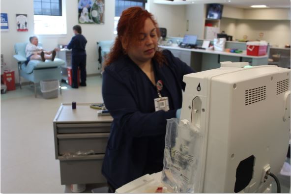 Blood Collection Tech Mayra Colunga-Lopez prepares the Alyx machine for the next double red cell donor.