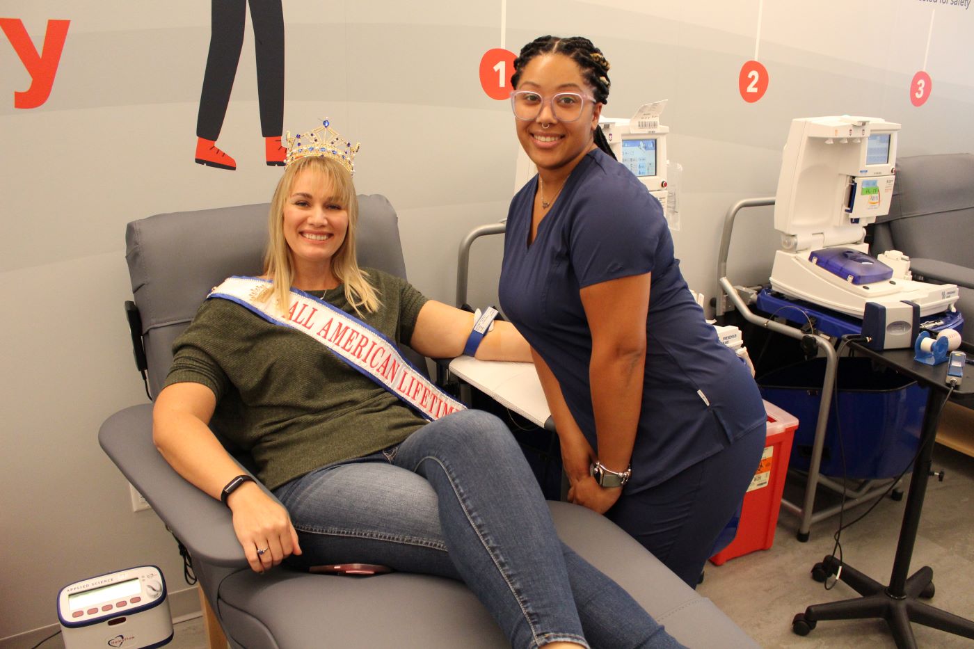 All-American Lifetime and former Mrs. All-American Kim Collins recently donated double red cells at her new, favorite location, the Middletown Donor Center in the Dove Run Shopping Center. She takes after her dad with her O positive blood.