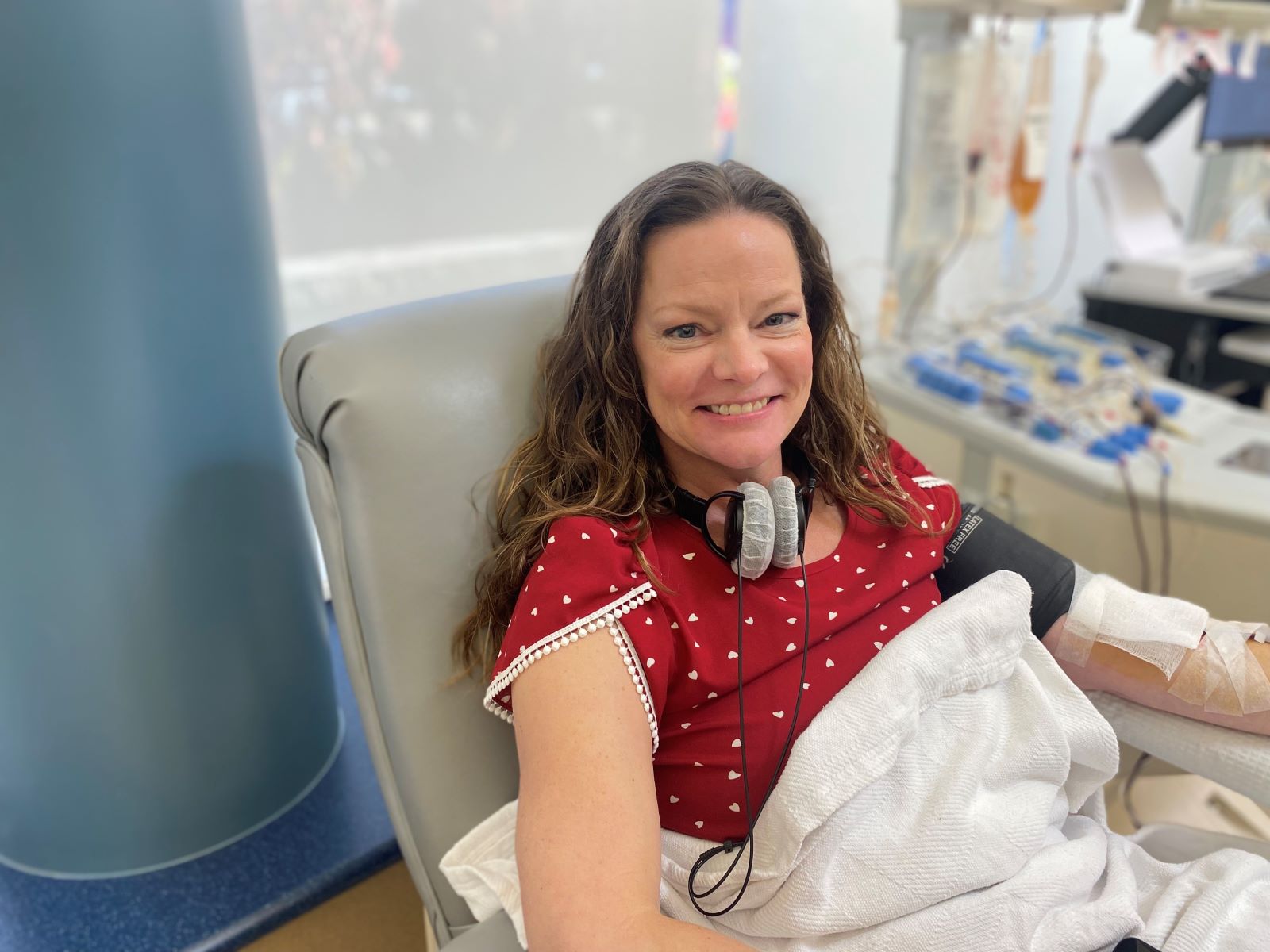 In apheresis, April Doughty donated platelets on November 6 and December 6. She has been inspired to donate a total of 19 times, thus far, and with good reason.